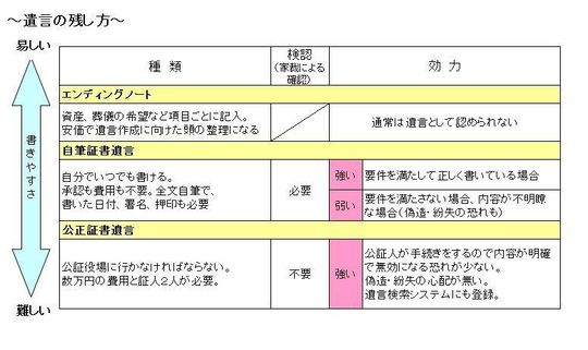 ※遺留分・・・法定相続人(兄弟姉妹を除く)に認められている絶対的な相続財産の受け取り分です。遺言書の内容が遺留分を無視するものであれば、遺留分を侵害された相続人は、遺留分を取戻す(減殺請求)ことができます。遺留分を無視した遺言自体は有効ですが、遺留分の取戻しが訴訟等のトラブルになる可能性がありますので、遺言の作成にあたっては遺留分のある相続人にも配慮するように注意する必要があります。